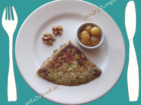 Unique to potato kookoo – due to its somewhat bland, pancake type of flavor – is the distinction of it being amenable to having a sweet companion, something like, I don’t know, maybe syrup or powdered sugar or jam. Or: candid, I mean candied, turnips! Candidly delightful candied turnips.