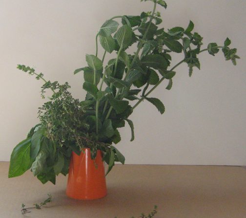 I had a different post planned for today but it’ll just have to wait, because, I mean, look at this bunch of glorious sweet basil, thyme and mint! I don’t know whether to look at it or eat it and I long to do both. A thing of beauty! I was given it by Suzanne – who had just picked them fresh from her garden, rinsed them, and then handed them to me tied up in a lovely bouquet rivaling what one might find at an artisanal flower shop. Just one of the many perks of having such a lovely neighbor. I have to tell you that the absolute pleasure of the surprise receipt of this luscious fragrant bunch of fresh garden-grown herbs was one of the purest delights of this weekend. A further delight to come is the fresh herb salad I’m planning on for dinner. Perfect for a hot summer night. Oh my tummy tum: wait till you see! Thank you Suzanne!
