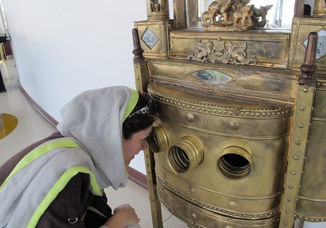 Banafsheh, who I like to call B, is a dear family friend, trilingual attorney, witty wordsmith, and (gratefully for me) avid shutter bug. All of the pictures in this post (unless specified otherwise) are hers that she shared with me. (Mer30 Banafsheh joon!) This first pic is of B peering into the viewfinder of a diorama — a 19th century mobile-theatre device invented in France — imported to and popularized in Iran by Mozafar od-din Shah, the then king of Iran, who came across its prototype in Paris.